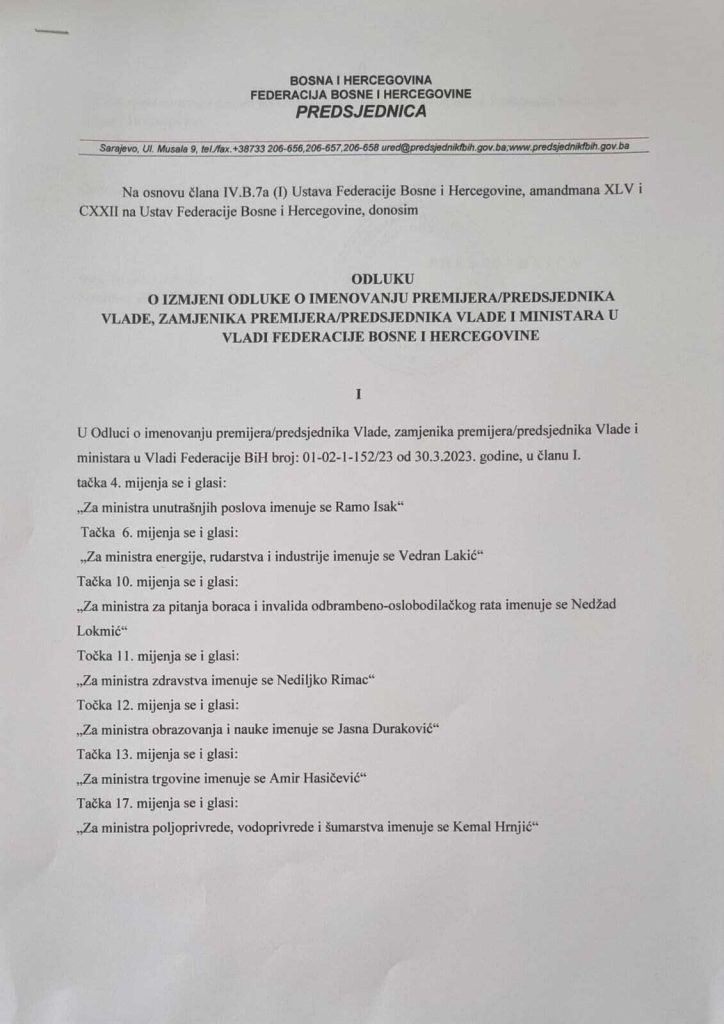 Predsjednica entiteta F BiH Lidija Bradara uputila je dopis u kojem obavještava Predstavnički dom Parlamenta F BiH da je došlo do promjena u sastavu predloženih kandidata za ministre.