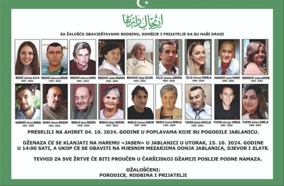 Dženaza-namaz bit će klanjana za osamnaest nastradalih osoba: Begić (Salem) Ajla 1995-2024., Begović (Muhamed) Ernad 1978-2024., Begović (Mahmut) Huma 1966-2024., Begović (Salko) Rahima 1948-2024., Begović (Alija) Zejna 1939-2024., Čilić (Ismet) Jasmin 1986-2024., Čilić (Fikret) Irmela 1992-2024., Imamović (Salih) Fikret 1960-2024., Imamović (Salko) Amira 1965-2024., Imamović (Fikret) Arman 1991-2024., Hindić ( Osman) Ibrahim 1964-2024., Maslo (Ibro) Redžo 1938-2024., Maslo (Alija) Nezira 1947-2024., Maslo (Fehim) Semir 1967-2024., Maslo (Ćamil) Đemila 1939-2024., Tufek (Salih) Hivzija 1959-2024., Tufek (Hivzija) Vedad 1975-2024., Tufek (Salko) Adela 1988-2024.