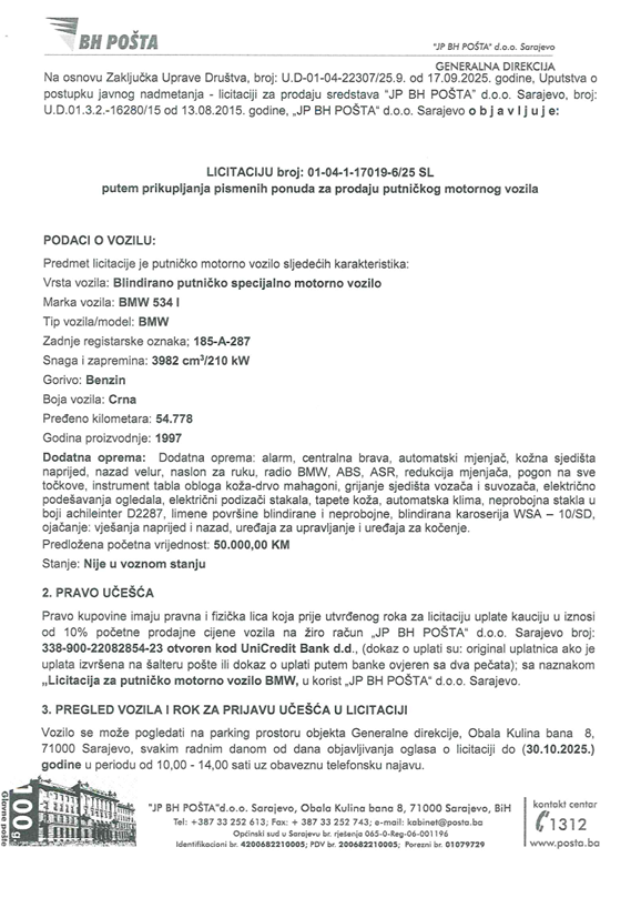Javno preduzeće BH Pošta objavilo je javni poziv za prodaju blindiranog putničkog vozila marke BMW 534 I, proizvedenog 1997. godine, po početnoj cijeni od 50.000 KM. Automobil se prodaje putem licitacije, a kako se navodi u oglasu, nije u voznom stanju, prenosi Klix.
