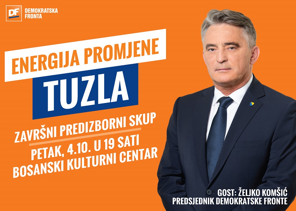 Gradski odbor Demokratske fronte Tuzla pozvao je sve članove, simpatizere i prijatelje, građane i građanke Tuzle, na završni predizborni skup koji će se održati 4. oktobra od 19 sati u BKC Tuzla.