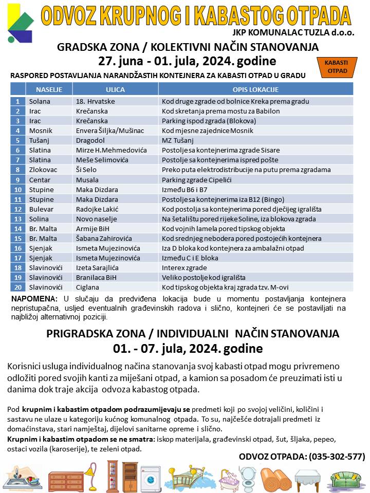 JKP Komunalac Tuzla: Počinje odvoz krupnog i kabastog otpada by Tuzla Info 24/06/2024 24/06/2024 | 12:03 Foto: Tuzlainfo.ba Podijeli JKP Komunalac Tuzla ove sedmice će početi sa prikupljanjem krupnog i kabastog otpada. Odvoz otpada počinje u četvrtak 27. juna i trajat će do 1. jula. Objavljen je i raspored, a detalji su dostupni na fotografiji ispod: jkp komunalac tuzlakabasti otpad