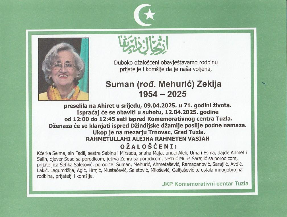 Ispraćaj Zekije Suman (rođ. Mehurić) biće održan u subotu, 12. aprila 2025. godine, od 12:00 do 12:45 sati ispred Komemorativnog centra Tuzla.