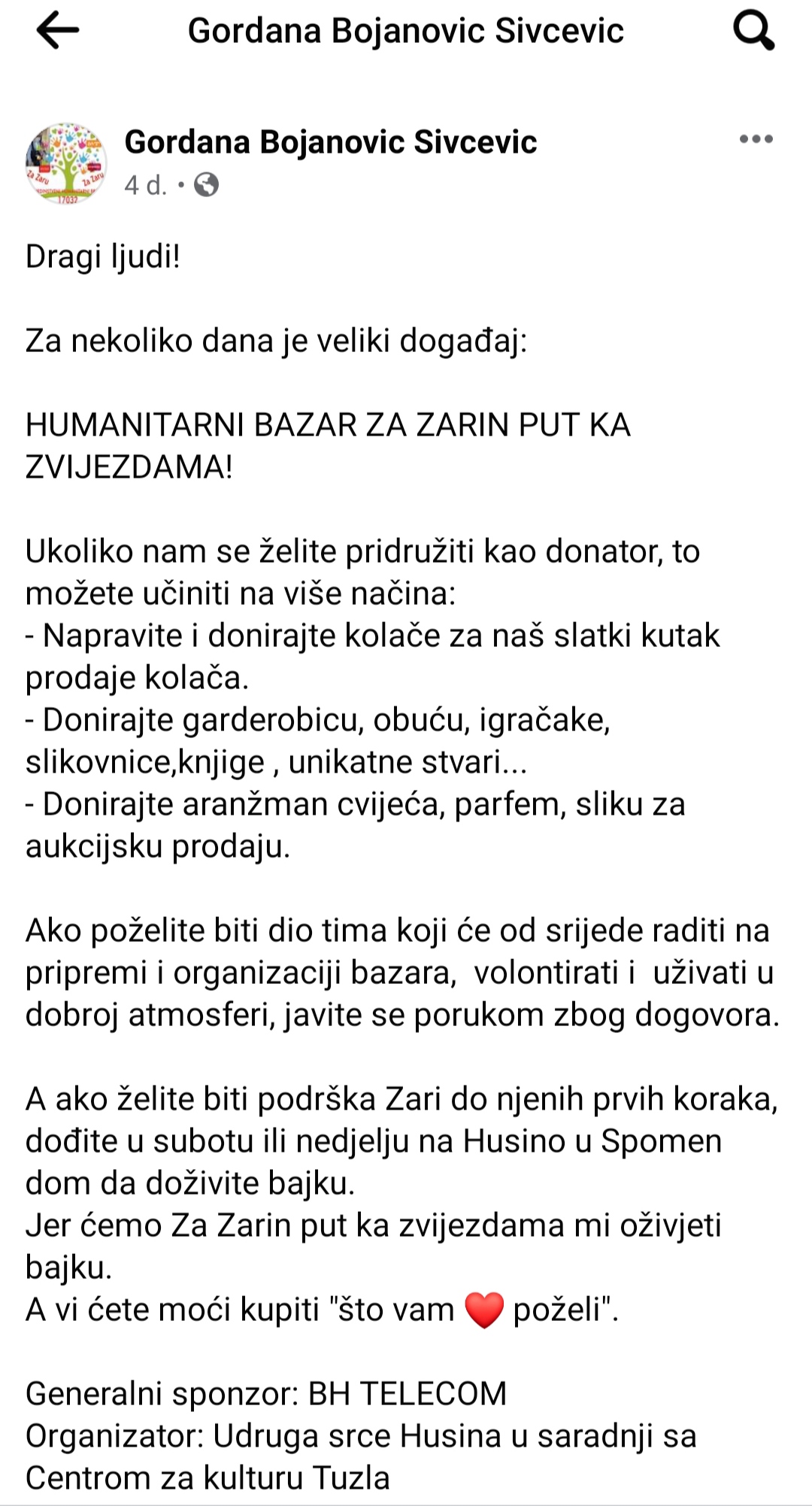 Humanitarni bazar “Zara ka zvijezdama” bit će održan 30.10. i 31.10.2021.godine u prostorijama Spomen doma Husinska buna na Husinu, a uz pomoć Udruga Srce Husina i uz podršku Centra za kulturu Tuzla. Generalni sponzor je BH telecom.