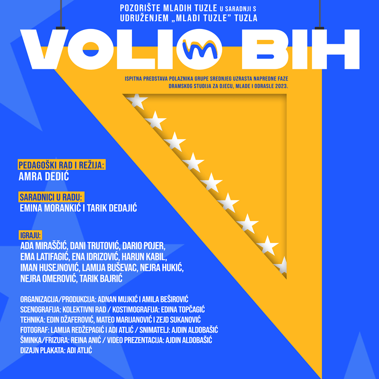 U srijedu, 27.12.2023. godine u 19.30h na sceni Pozorišta mladih Tuzle (dvorana Kaleidoskop) biće premijerno izvedena predstava „VOLIM BiH“ nastala kao finalni rezultat rada grupe srednjeg uzrasta napredne faze Dramskog studija za djecu, mlade i odrasle Pozorišta mladih Tuzle. Ovo je osma premijera u 2023. godini koju producira Pozorište mladih Tuzle u saradnji s Udruženjem „Mladi Tuzle“ i Srednjom „Savremeno – umjetničkom školom“ Tuzla.