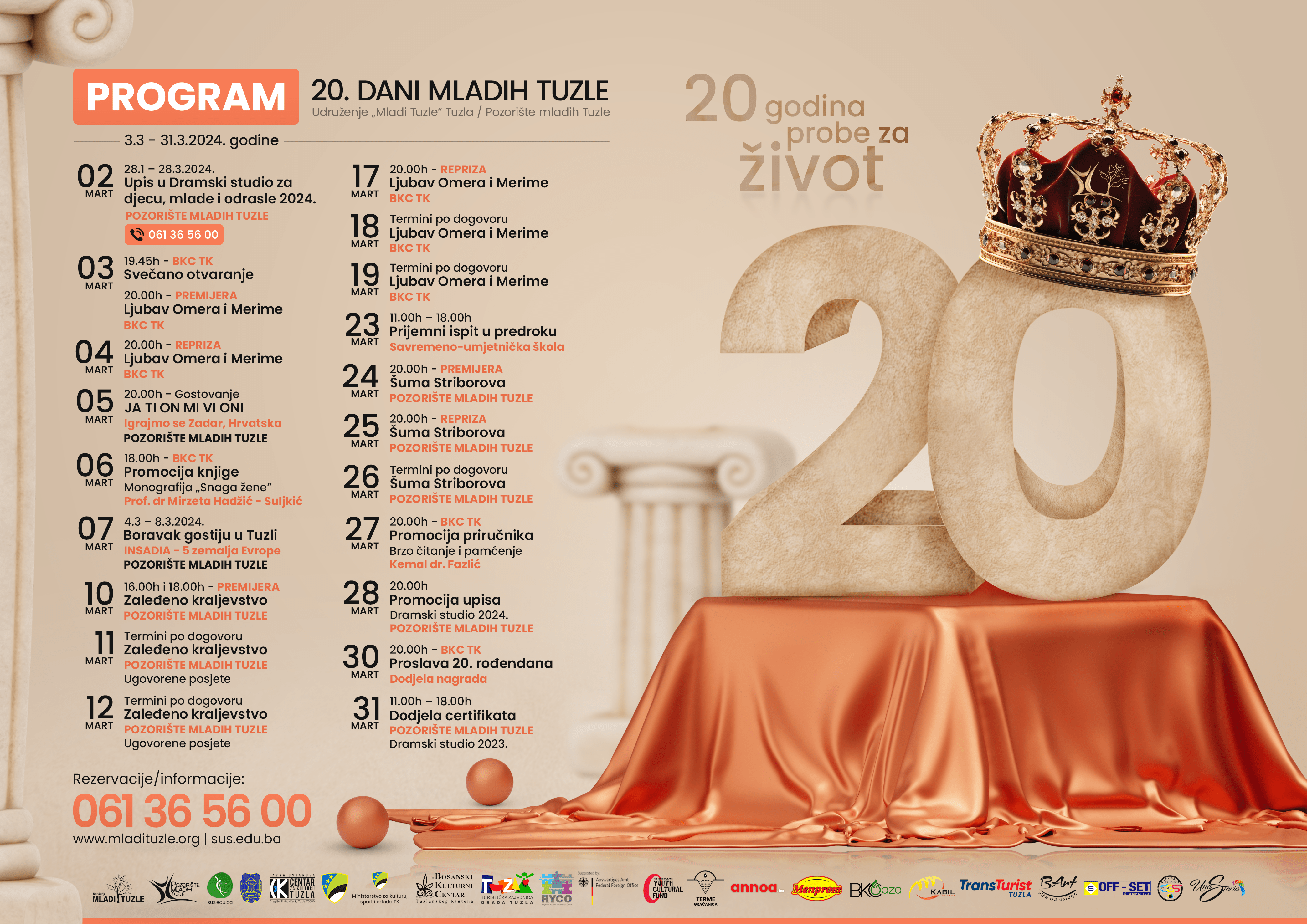Danas je zvanično objavljen program „20. Dana Mladih Tuzle“ kojim se u periodu od 3 – 31.marta 2024. godine obilježava dvadeset godina kontinuiranog, uspješnog djelovanja i rada Udruženja „Mladi Tuzle“ i Pozorišta mladih Tuzle. Ovogodišnju manifestaciju čini 20 događaja iz kulture, umjetnosti, odgoja, obrazovanja i informisanja namijenjenih za sve uzraste publike. Cjelokupan program obilježava se pod sloganom „20 godina probe za život“ što su Mladi Tuzle za svoje korisnike bili svih 20 godina postojanja primjenjujući pozorište kao model za zdravo odrastanje djece i mladih.