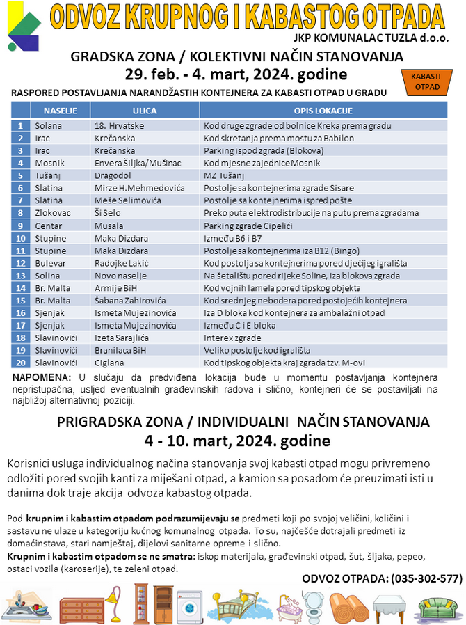 Nova akcija prikupljanja krupnog i kabastog otpada u gradskim zonama predviđena je za period od 29. februara do 4. marta, dok će u prigradskim mjesnim zajednicama akcija biti od 4. do 10. marta ove godine.