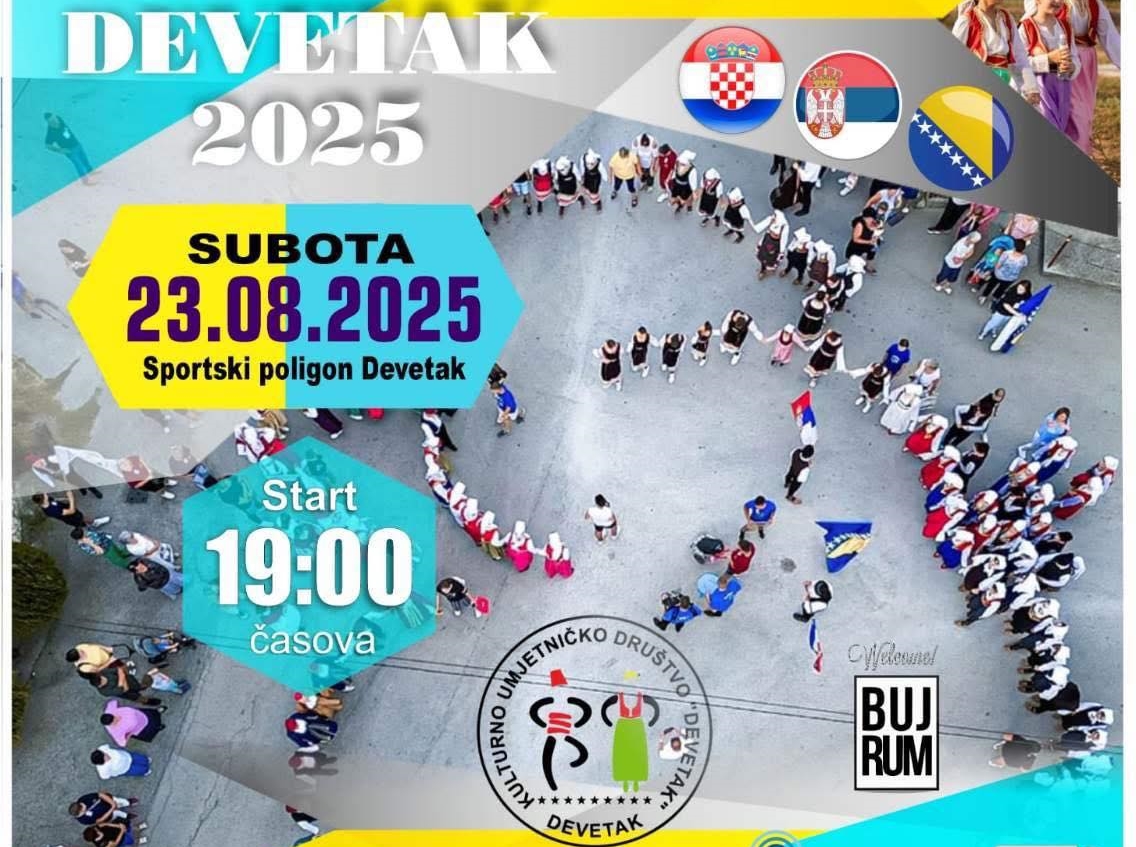 Na sportskom poligonu u Devetaku, 23. augusta 2025. godine s početkom u 19:00 sati, bit će održan 12. Međunarodni festival kulturno-umjetničkog stvaralaštva “Devetak 2025”.