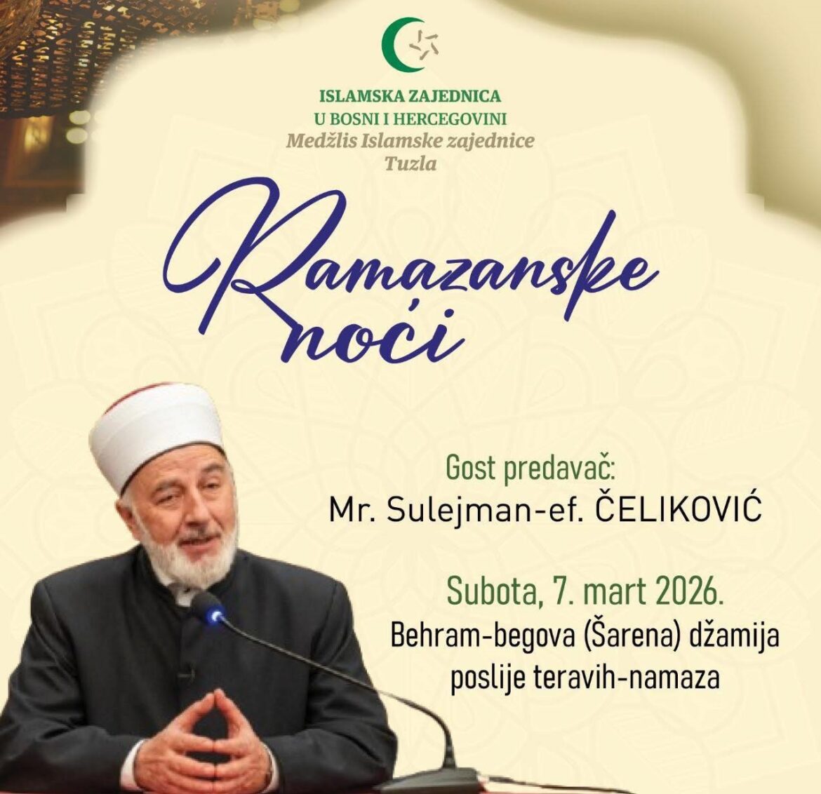 Gost predavač ove večeri bit će mr. Sulejman-ef. Čeliković, koji će prisutnima uputiti poruke nadahnuća te podsjetiti na univerzalne vrijednosti vjere, zajedništva i međusobne bliskosti u mubarek mjesecu ramazanu.