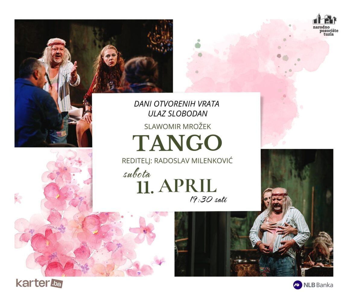 Predstava „Tango“, autora Slawomira Mroźeka, u režiji Radoslava Milenkovića, donosi snažnu priču o sukobu generacija, vrijednosti i društvenih normi. U predstavi igraju Adnan Omerović, Nermin Omić, Elvira Aljukić, Remira Osmanović, Milenko Iliktarević, Elvis Jahić i Jana Miletić.
