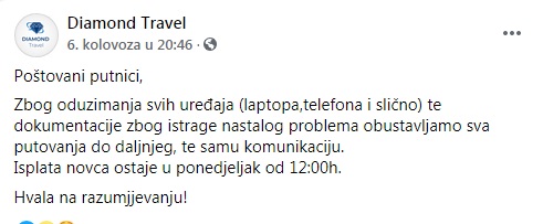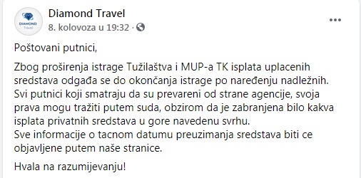 Od početka svog rada, Diamond travel agencija je nudila izuzetno povoljna ljetovanja, kako na Jadranu tako i u Turskoj, što je odmah privuklo veliki broj građana, koji su očigledno ostali i bez novca i bez odmora. Iz Turističke agencije su poručili i da svi putnici koji smatraju da ih je agencija prevarila, svoja prava mogu tražiti putem suda.