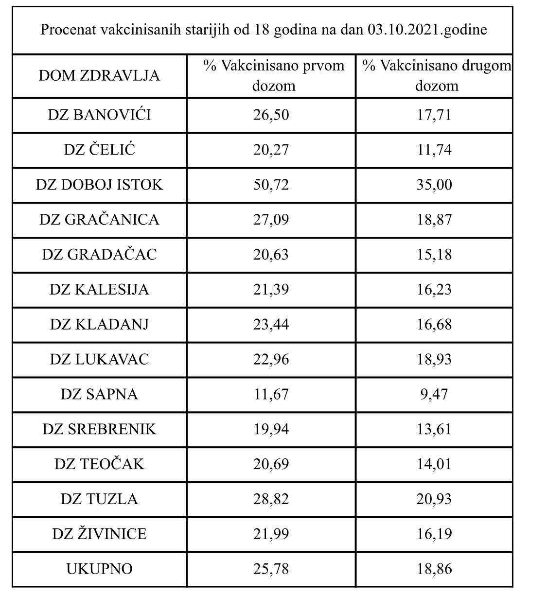 Najveći odziv za vakcinaciju je u općini Doboj Istok, gdje je prvom dozom vakcinisano više od 50 posto stanovništva, dok je najmanji odziv u općini Sapna, gdje je prvom dozom vakcinisano svega 11,67 posto građana.