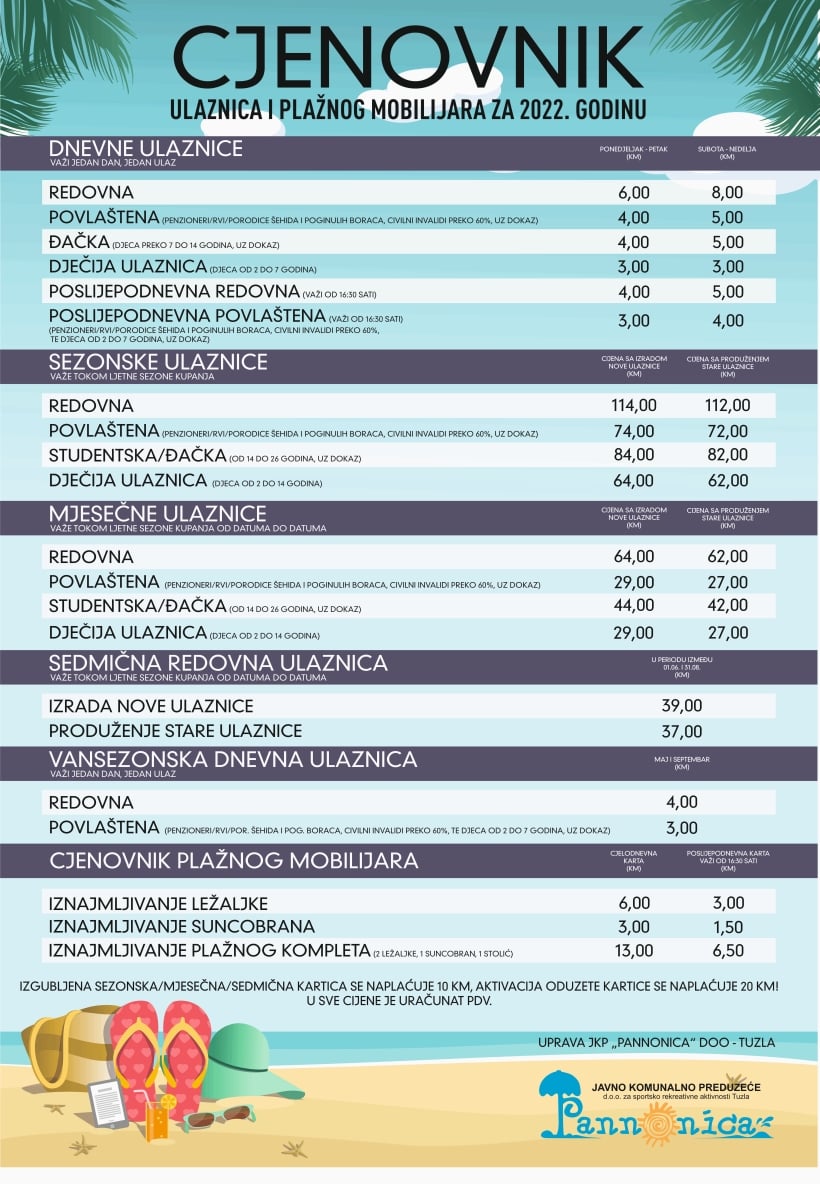 “U ponedeljak 09.05.2022.g. kreće prodaja sezonskih, mjesečnih i sedmičnih ulaznica po redovnim cijenama. Prodaja se vrši svaki radni dan od 11h.-14h u upravnoj zdradi JKP Pannonica d.o.o.T uzla na prvom jezeru kompleksa Panonskih jezera” – saopćeno je iz preduzeća.