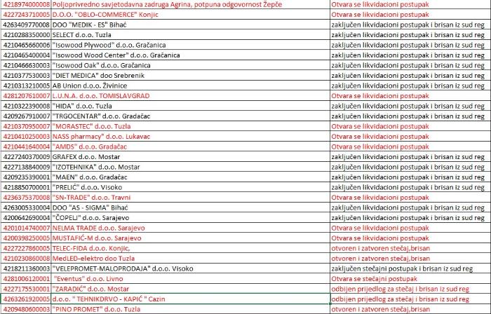 Likvidacioni postupak je pokrenut u firmama “EMDV”, “Providing” i“Fer gradnja” iz Sarajeva, “Luna” iz Tomislavgrada, “AMDS” iz Gradačca.