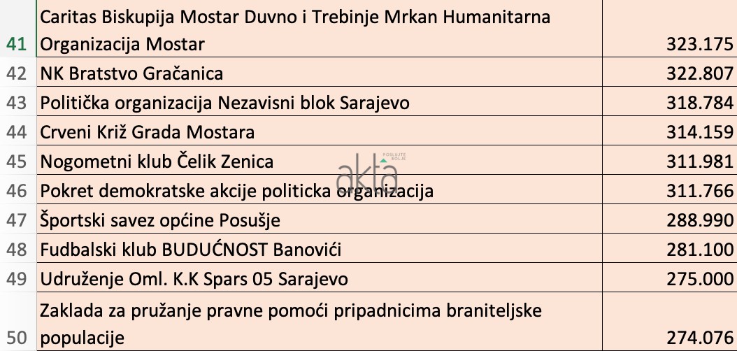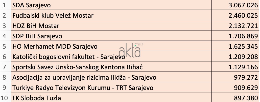 Kao i svake godine, na vrhu liste nalaze se političke organizacije. Tako je i 2021. godine najviše novca iz budžeta “izvukla” SDA Sarajevo i to preko tri miliona KM. Slijedi je FK Velež sa 2,4 miliona KM, te stranke HDZ BiH sa 2,1 milion KM i SDP BiH 1,7 miliona KM, kao i Fudbalski klub Sloboda koji se nalazi na 10. poziciji sa iznosom od 897.370 KM.