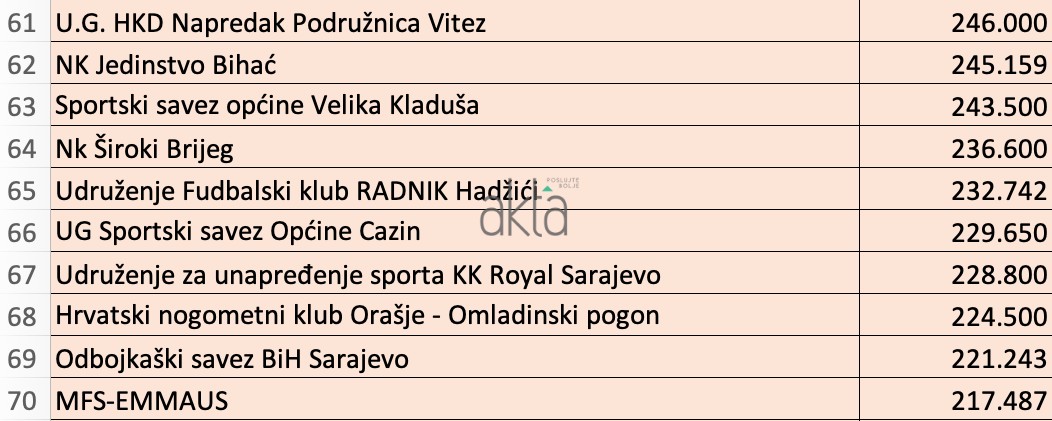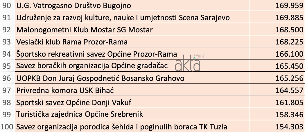 Značajna sredstva dobio je veliki broj boračkih udruženja i saveza, a za razliku od prethodnih godina, na ovogodišnoj listi uglavnom dominiraju sportska udruženja piše Akta.ba.