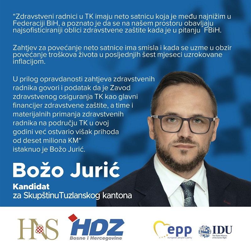 Da se zahtjevi zdravstvenih radnika mogu ispuniti govori i podatak da je Zavod zdravstvenog osiguranja TK kao glavni financijer zdravstvene zaštite a time i materijalnih primanja zdravstvenih radnika na području TK u ovoj godini već ostvario višak prihoda od deset miliona KM“ istakao je Božo Jurić za čijeg mandata kao ministra zdravstva je potpisan važeći