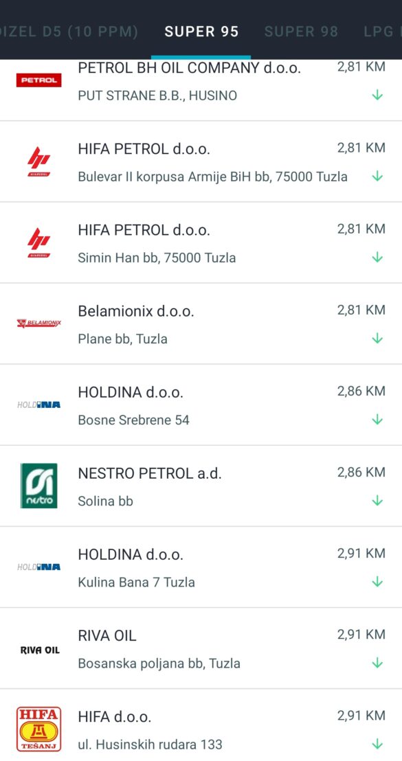 U BiH ponovo skuplje gorivo: Nove cijene i na tuzlanskim pumpama by Tuzla Info 10/09/2022 10/09/2022 | 10:22 Podijeli U Bosni i Hercegovini je ponovo došlo do poskupljenja goriva. Prema podacima sa aplikacije Federalnog ministarstva trgovine, cijene dizela u prosjeku su oko 3,5 KM dok benzin košta između 2,71 i 3,11 KM. Najjeftiniji dizel u Tuzli košta 3,31 KM, dok najniža cijena benzina iznosi 3,11 KM. gorivoposkupljenje