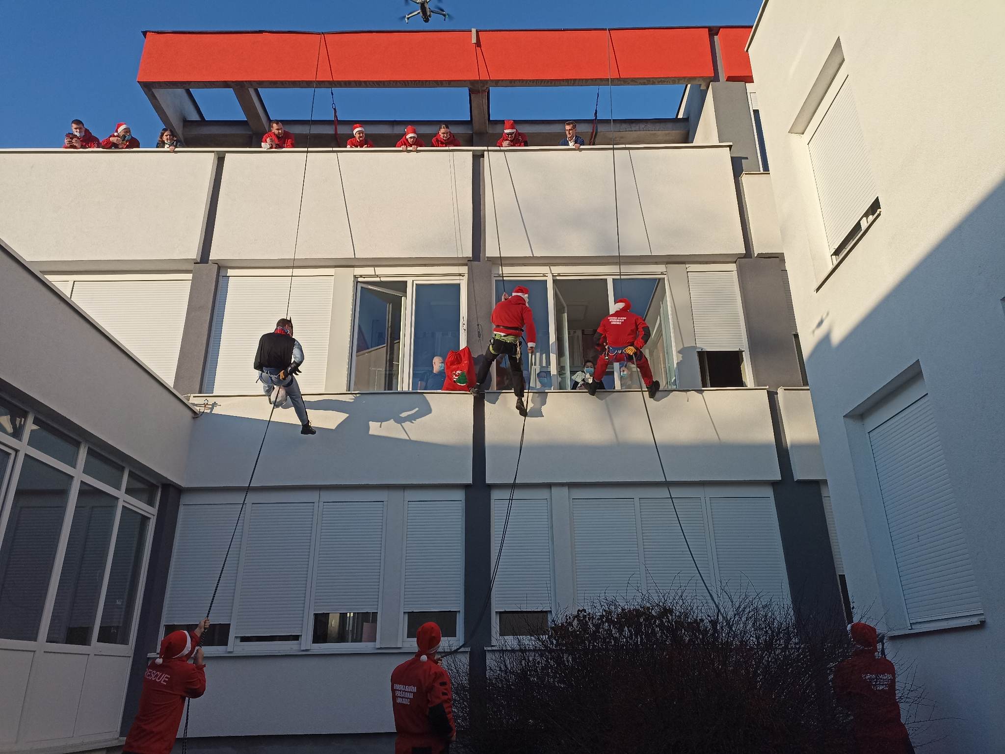Ova aktivnost održana je i prošle godine, a spuštanje Djeda Mrazova i Batmana s krova bolnice posebno je obradovala najmlađe pacijente koji su ih dočekali na prozorima.