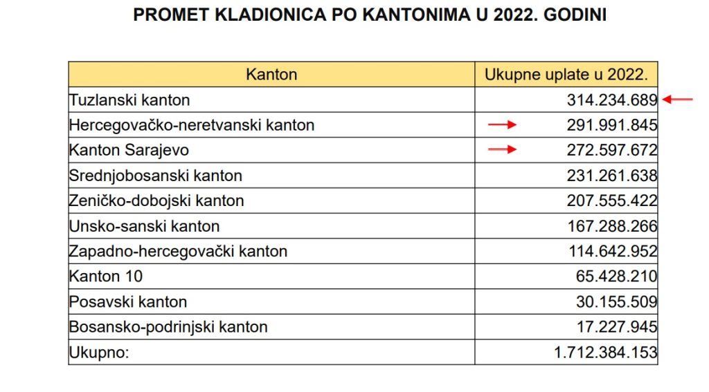 Ono po čemu Tuzlanski kanton prednjači su uplate u kladionicama. Od ukupno 1,71 milijarde KM uplaćene u kladionicama građani Tuzlanskog kantona su uplatiti 314.2 miliona KM, što je skoro 20 posto od ukupnog broja uplata u FBIH.