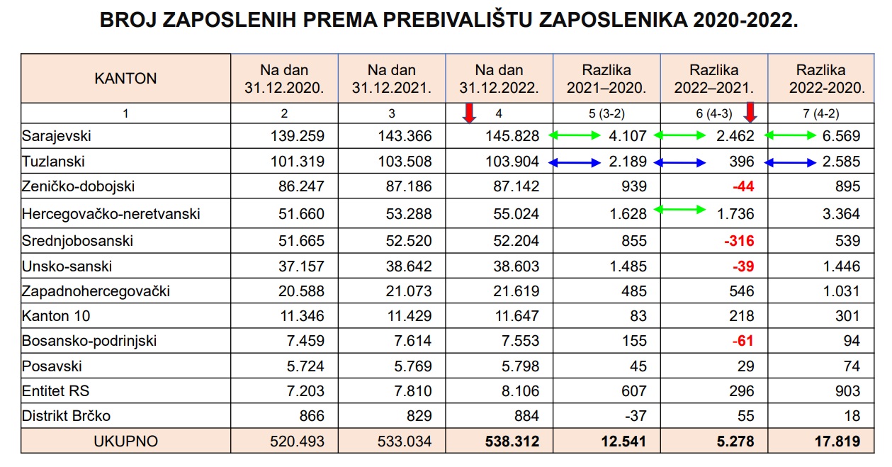 Pema podacima Porezne uprave, u 2022. u FBiH bilo 538.312 zaposlenih osoba, što je za jedan posto više u odnosu na prethodnu godinu. Najviše zaposlenih je u Sarajavskom kantonu (145.828) i Tuzlanskom kantonu (103.904).