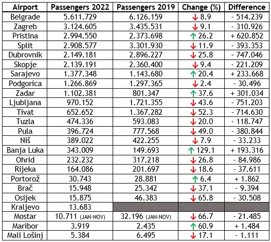 Beogradski aerodom je zadržao poziciju najprometnijeg u bivšoj Jugoslaviji, dok se Zagreb vratio na drugo mjesto prvi put od 2019., nadmašivši i Prištinu i Split, koji su je prestigli tokom pandemijskih 2020. i 2021. Za Prvi put, Skoplje je bilo na samo 10.000 putnika od Dubrovnika, dok je Sarajevo preteklo Podgoricu. Unatoč bankrotu Montenegro Airlinesa 2019., Aerodrom Podgorica je uspio gotovo nadmašiti svoje rekordne rezultate iz 2019., samo 2,4% ispod svojih brojki prije pandemije. Kraljevači aerdorom Morava debitirala je na popisu, opsluživši 13.683 putnika tokom prve pune godine rada, piše Exyuaviation .