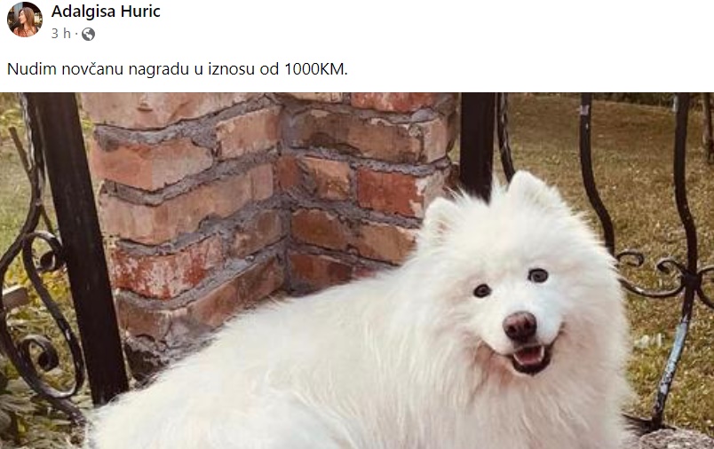 U objavi stoji i da vlasnici nude novčanu nagradu od 1000 KM. /Tuzlainfo/