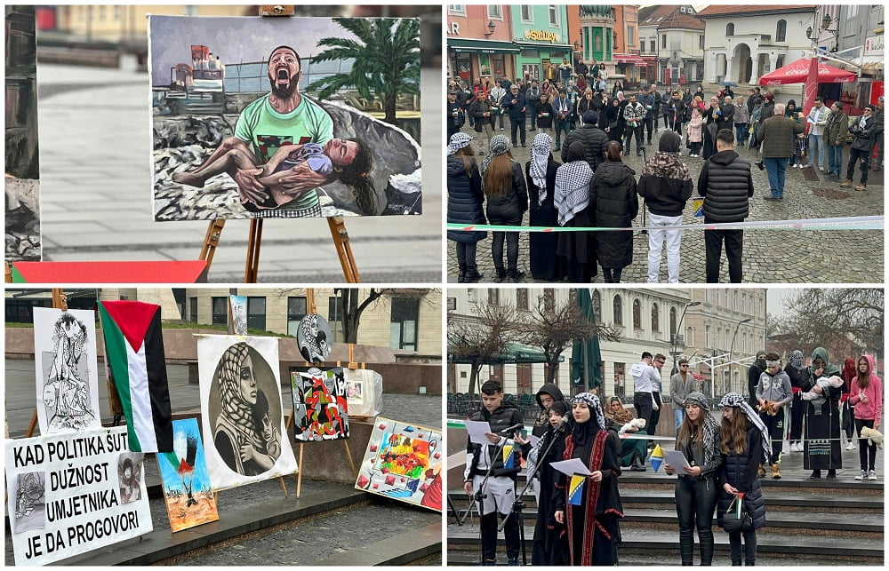 Grupa bosanskohercegovačkih slikara i drugih umjetnika, u saradnji sa Udruženjem Palestinska zajednica u Bosni i Hercegovini i JU BKC „Alija Izetbegović“ Kalesija, u nedjelju je centru Tuzlw realizirala performans „GUERNICA – GAZA“, u znak podrške narodu Palestine i Gaze.