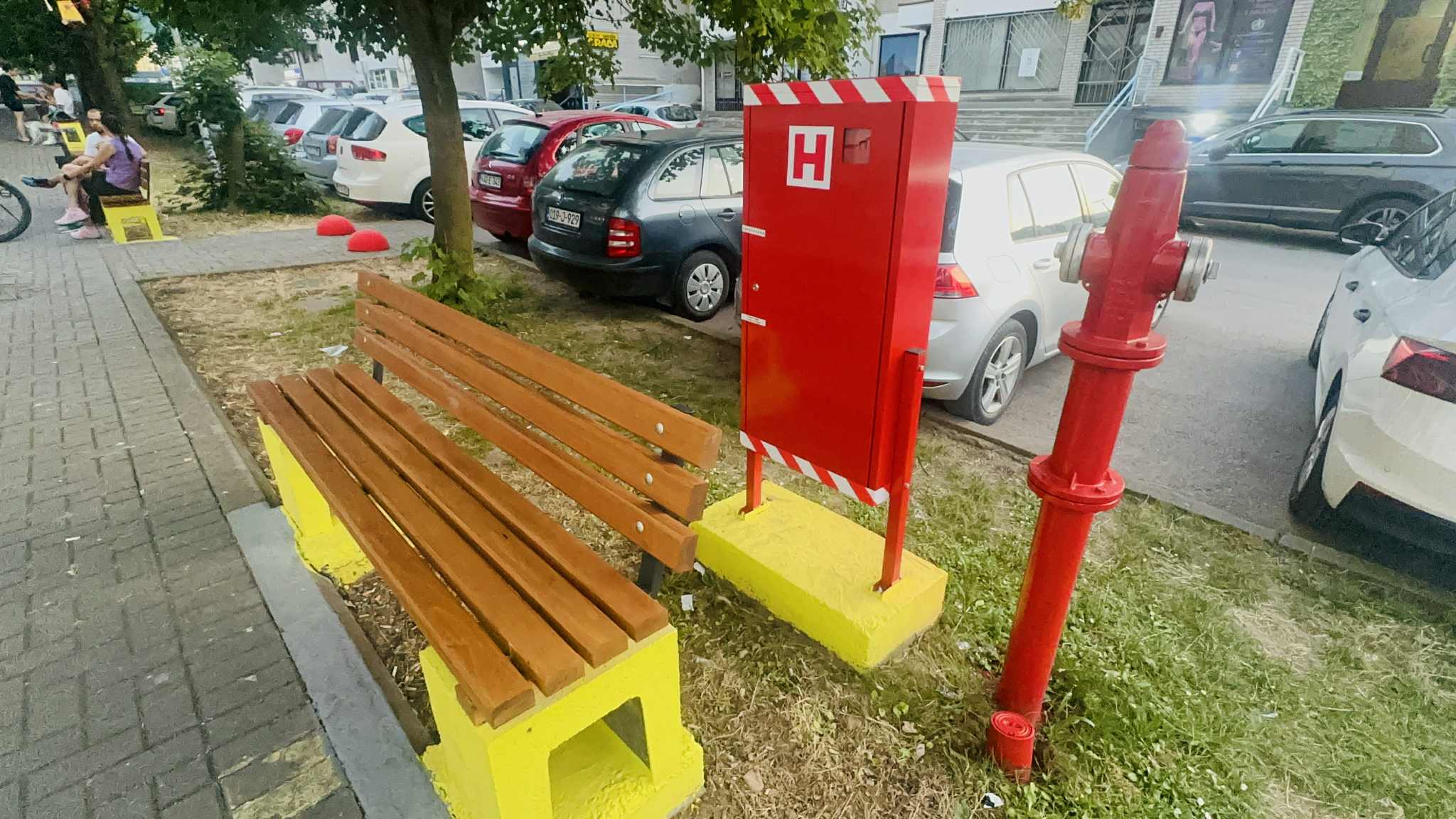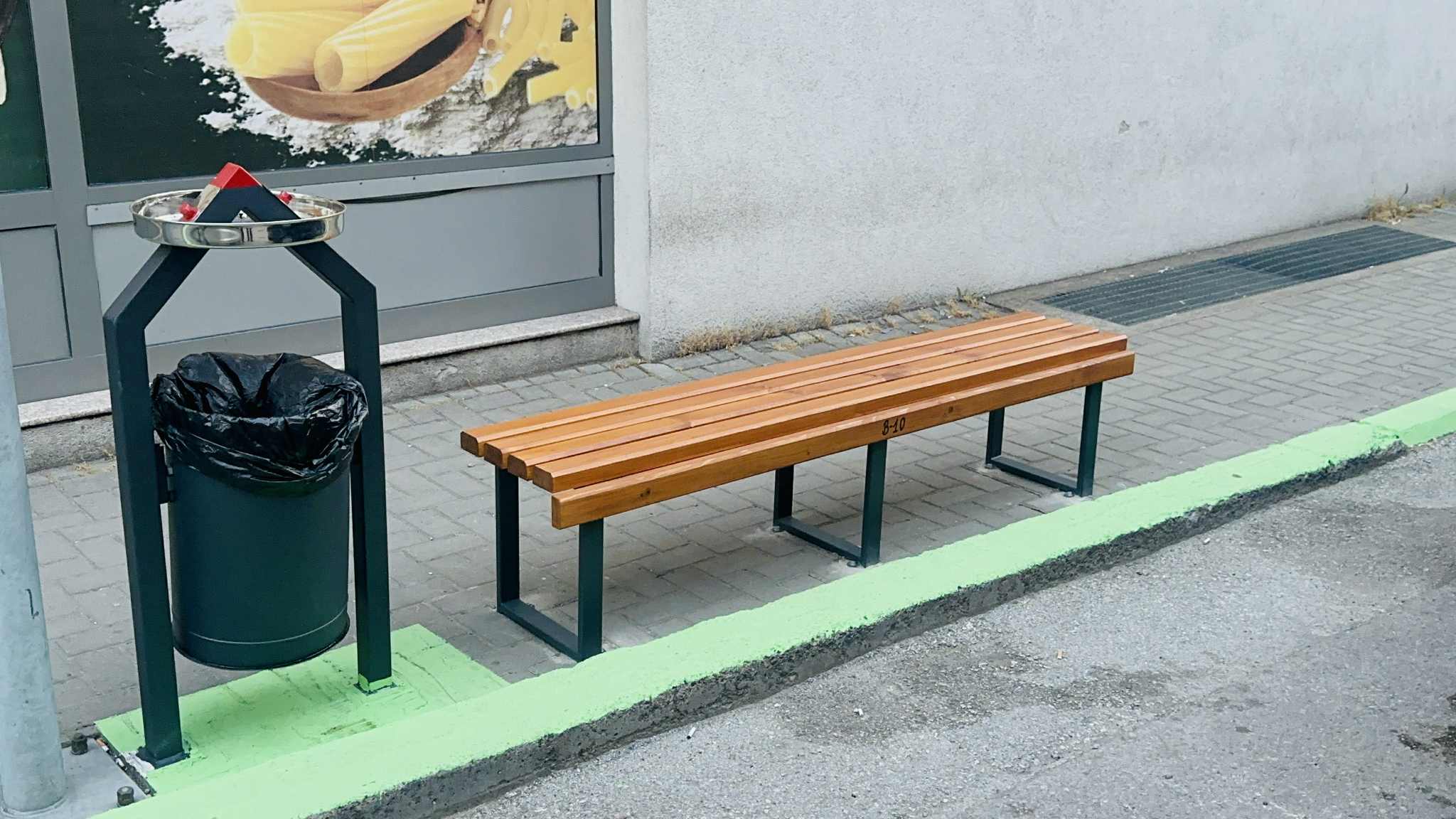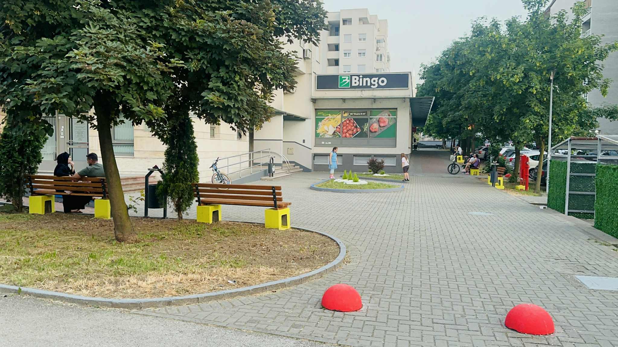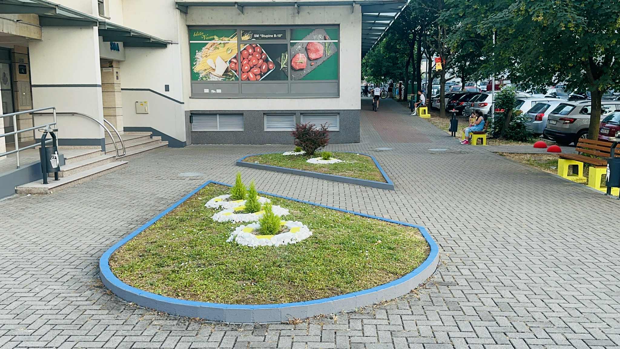 Ali, nije samo krov njegovo platno. Iscrtane su i linije na betonu kako bi se znalo koji prostor pripada kojem poslovnom subjektu – ispred objekta Bingo linije su u zelenoj boji, ispred zgrade u plavoj. Kontejner za smeće je ograđen ukrasnom travom da bi se smanjio vizuelni nered, a nove kante za smeće, s pepeljarama napravljenim od konobarske tacne, Dževad je izradio vlastitim rukama.