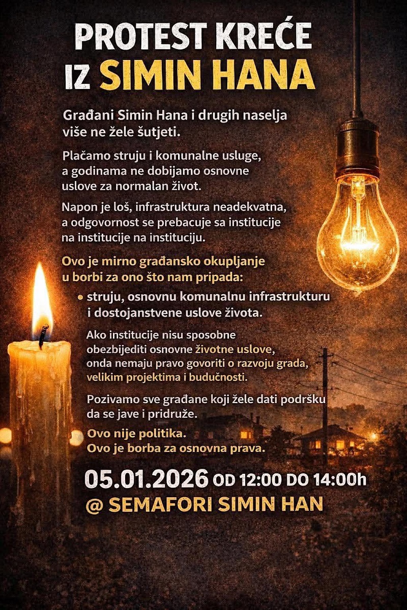 Stanovnici Simin Hana i okolnih naselja najavili su mirno građansko okupljanje nezadovoljni dugogodišnjim problemima u snabdijevanju električnom energijom, ali i, kako navode, zapostavljenom komunalnom infrastrukturom. Iako redovno izmiruju obaveze za struju i druge komunalne usluge, mještani tvrde da već godinama nemaju osnovne uslove za normalan i siguran život.